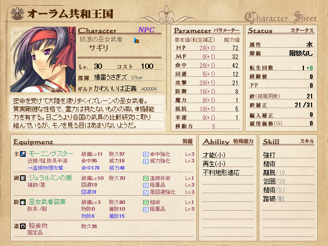 能力値も1つとして20を超えず、スキルも槌術の他は、強打、包囲、疾走、離脱が1つずつ。なんとも中途半端ですよね。サギリさんは案外、優柔不断な性格なのかもしれません。