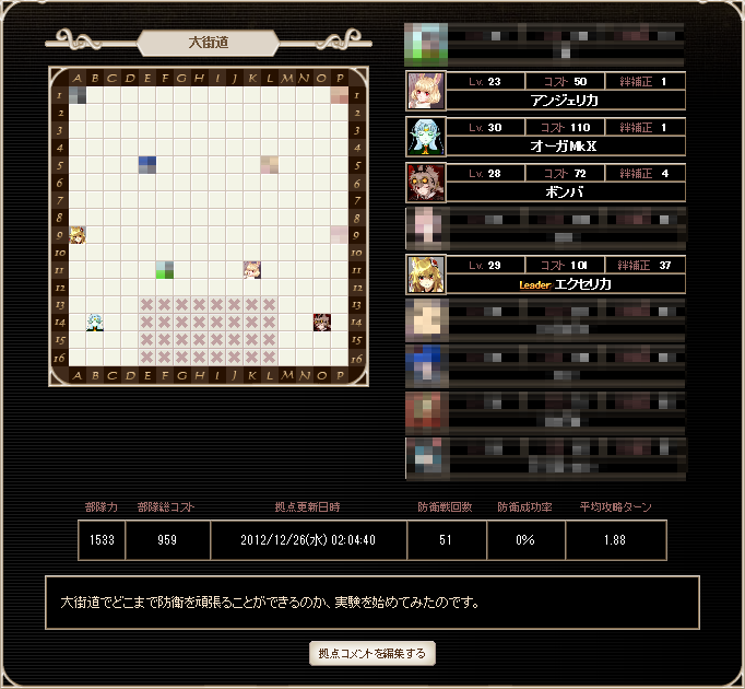 自キャラが「逃亡」持ちの場合は、無視されないように工夫が必要となりますが、そんな「逃亡」キャラをE11に配置すれば無視はされなくなります。遠征側の手番を1つ失わせることができれば、防衛の仕事はできており、無視されるよりはるかに良いです。(自キャラが容易に倒されてしまうのは悲しい所ではありますが…)